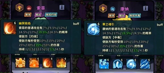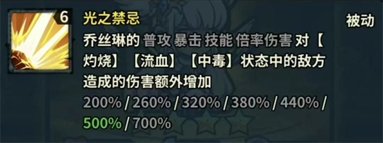 3、要想激活乔丝琳2技能的效果,就需要一个辅助角色(俗称“挂件”)协助她给怪物施加异常状态。由于乔丝琳是光属性英雄,出血、灼烧、中毒等任意一种异常状态都能触发她的增伤效果,所以在选择提供异常BUFF的挂件英雄时较为灵活,不同选择各有其优势与不足。