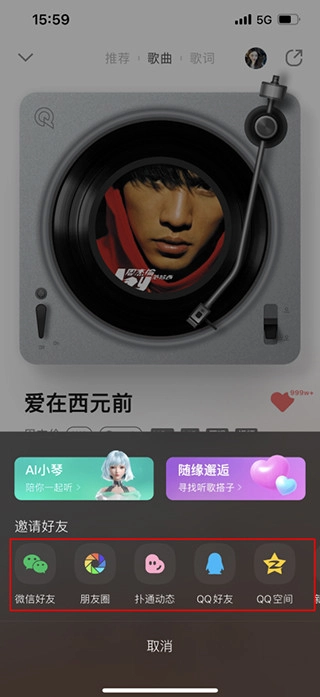 当弹出邀请好友的界面后,你会看到多种不同的邀请方式,挑选一种自己喜欢的方式发出邀请,等好友点击你分享的链接进入,就能和你一起听歌啦。