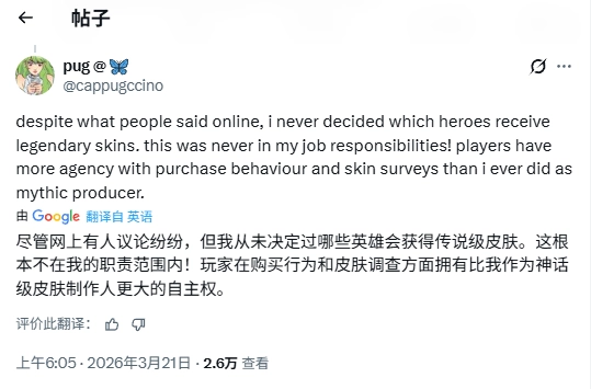 尽管网络上流传着不少关于我的说法,但我从来没有决定过哪个英雄能拿到传说级皮肤。这根本就不在我的工作范畴内!真正左右这个决定的,是玩家购买皮肤的数据和问卷调查的反馈。我明白,当大家感到失望时,总需要一个可以宣泄情绪的对象,而我恰好是最容易被选中的那个靶子。