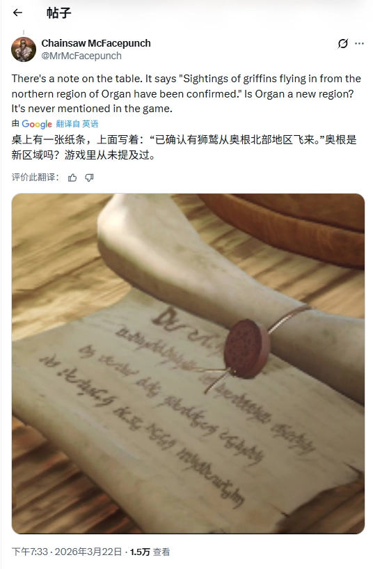 此外,贺图里餐桌上的信件也受到了关注。这封信是用Gransys文字写的,玩家翻译后发现内容是:“已确认有狮鹫从北部的Organ地区飞来”。联系之前提到的神秘角色的穿着特点,有玩家猜测,未来可能推出的扩展内容或许会围绕北部名为Organ的雪地区域展开,那个神秘角色说不定也会在其中出现。