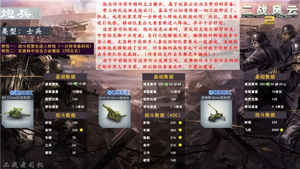 2、炮兵和步兵一样,防御力极低,反坦克炮防御为0,后两者也只有50,如果被敌方突击后排就不要想着跑了,硬刚到最后吧!