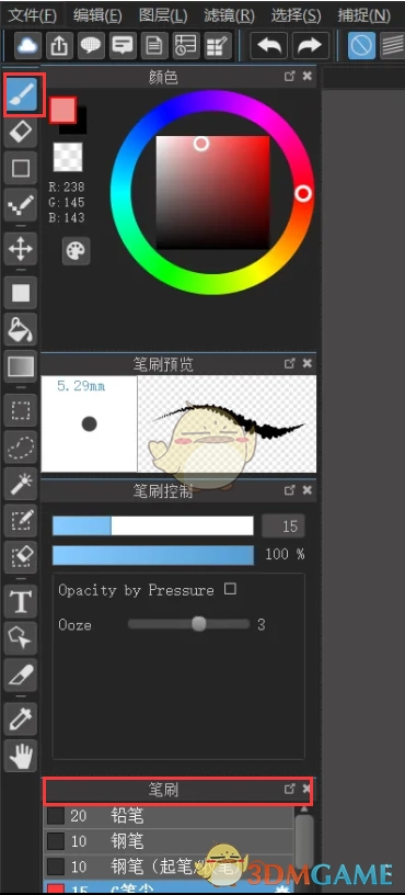 2、在左侧工具栏里点击第一个“画笔工具”图标,然后在右侧面板中找到“笔刷”选项窗口。