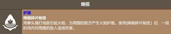 辣椒碎片饼干的“辣椒碎片秘技”堪称绝招,这也是它重要的团队辅助手段之一。施展时,辣椒碎片饼干会用力猛击地面,触发火焰冲击,让范围内的所有队友都获得一个强劲的火焰护盾。