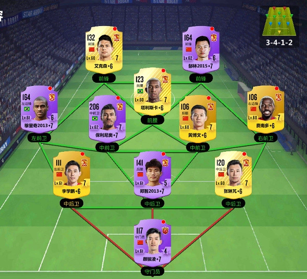 3、如果没有紫卡的玩家,边路可以换成韦世豪,中路可以换成金卡郑智,守门员可以换成刘殿座。
