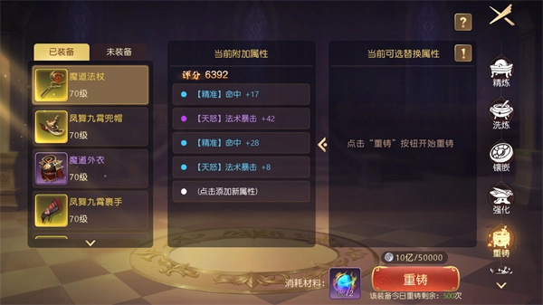 40级将解锁重铸系统,玩家可消耗秘法石与银币,对装备的属性数量、类型及具体数值进行调整。需要注意的是,仅紫色及更高品质的装备支持重铸操作,且装备品质不同,其可拥有的最大属性数量也存在差异。