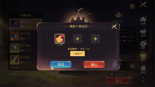 2当角色等级达到28级时,强化功能将正式解锁。玩家可通过消耗指定材料来提升装备的强化等级,每次强化成功都能为装备的基础属性带来百分比的加成效果。不过需要注意的是,当强化等级较高时,操作会存在一定的失败概率。若强化失败,系统会为该装备增加祝福值,当祝福值累积满后,装备将自动进入下一强化阶段。此外,玩家还可以使用幸运石来提升强化的成功率。特别值得一提的是,当强化失败次数达到设定的上限后,下一次进行强化操作时将必定成功。