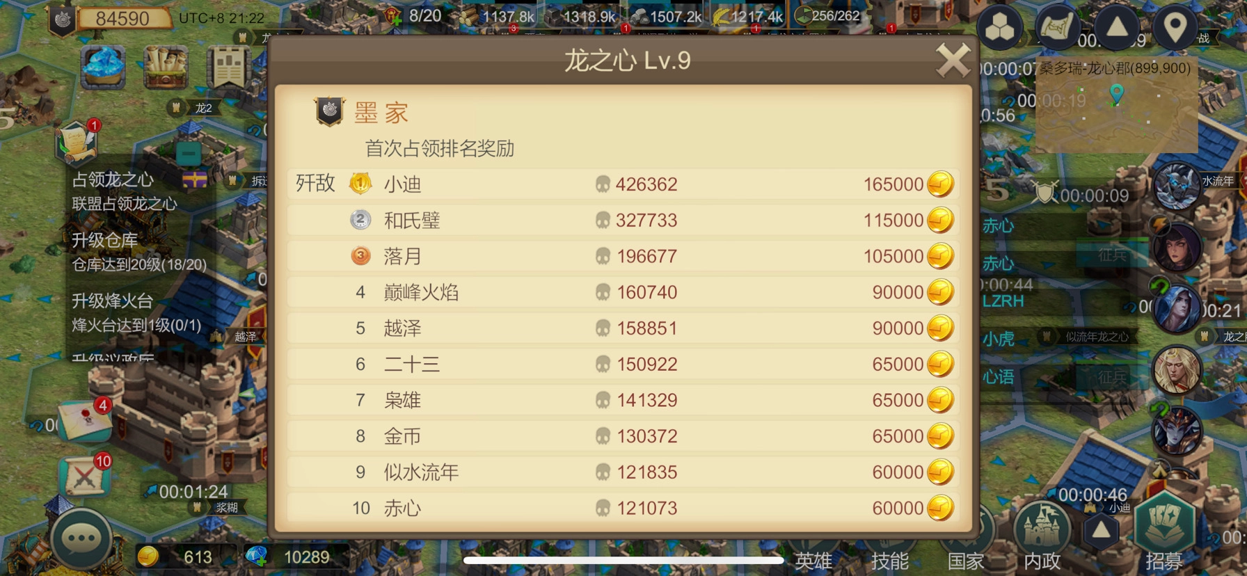 目标:参考8级关卡“鹰巢山”的杀敌排名情况,优先把主城迁移到龙之心周边(推荐距离不超过3格),分城之间要保持1格以上的间隔,保证内河区域都布满分城。