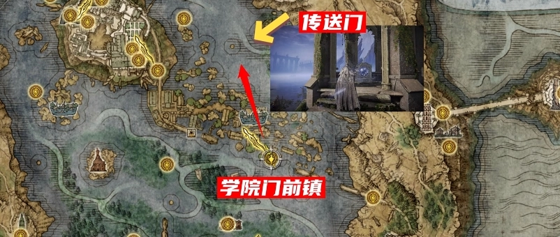 首先是塞尔维斯支线的触发方式,我们得去学院门前镇的赐福点,赐福上方有个带小圆圈图标的传送门,借助这个传送门就能抵达王室领地废墟。