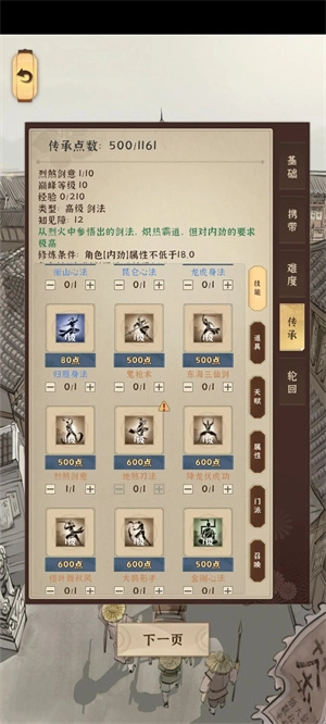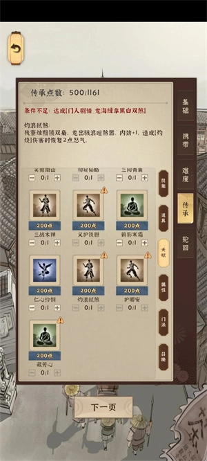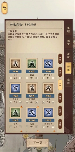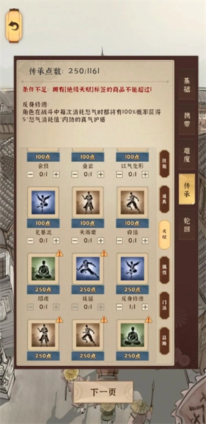 到这个传承点这里,最多花费550点就够了,然后回过头来修习“修德”“炽浪”“以气化形”这几项。剩下的部分,只要根据词条和武功的情况来提升伤害就行。