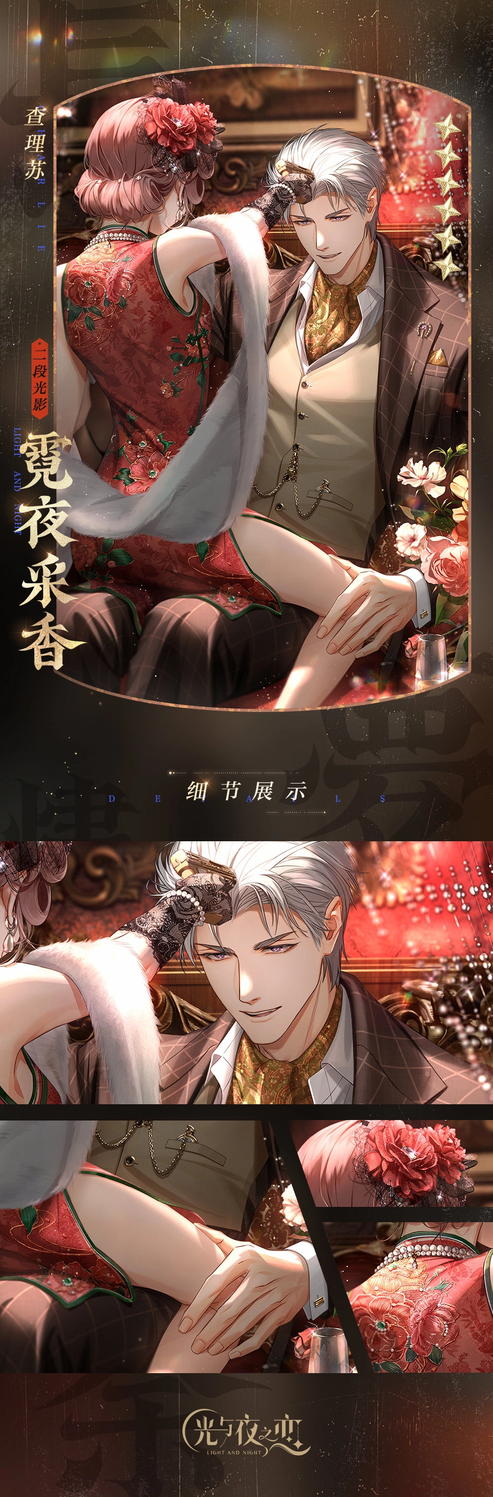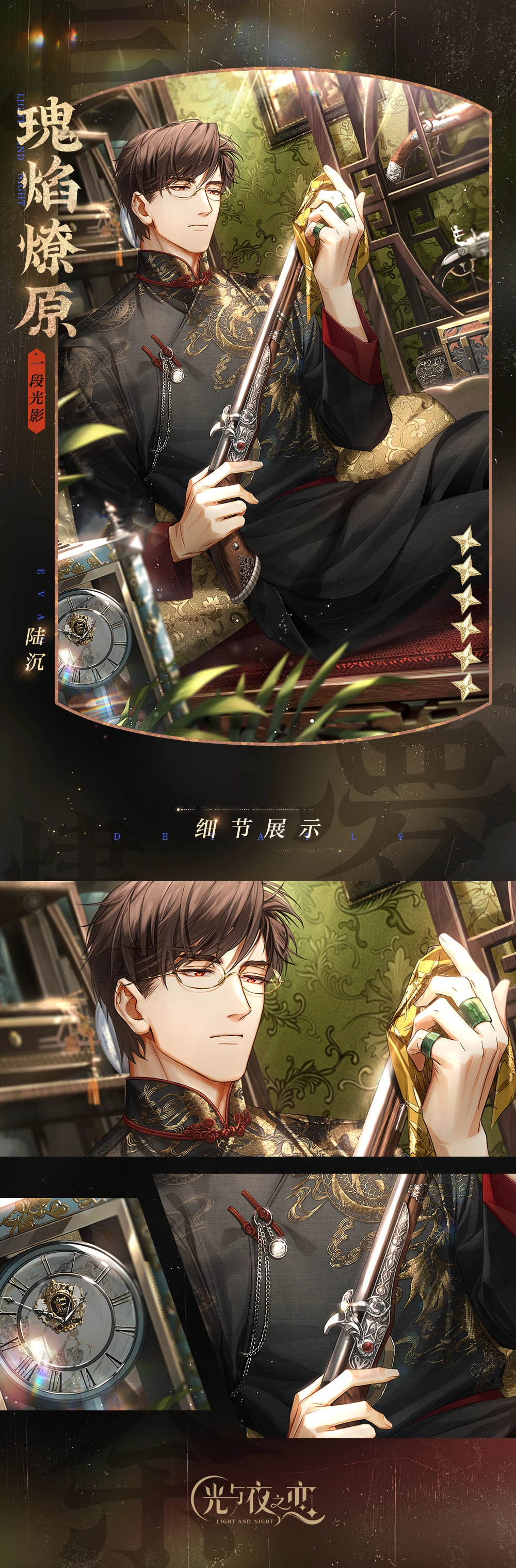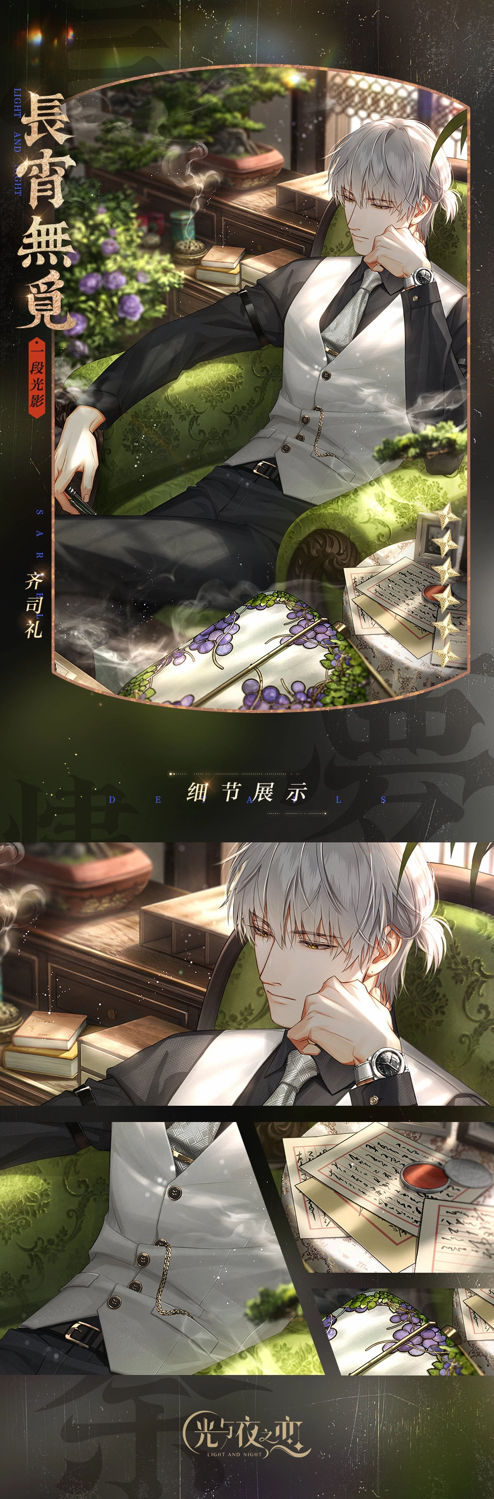 本次为大家呈现的是《光与夜之恋》2022年的七夕卡面,此次活动“长梦烬余痕”以民国为主题,各位男主角都换上了民国风格的装扮,让我们与他们一同感受民国风的乞巧节氛围。