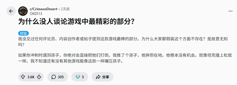 自《红色沙漠》推出后,它开放世界的沙盒高自由度就一直是玩家们关注的重点。最近,有玩家注意到游戏里存在允许角色冲撞儿童NPC并将其撞倒的设定,这一机制在玩家社区中引发了不少讨论。