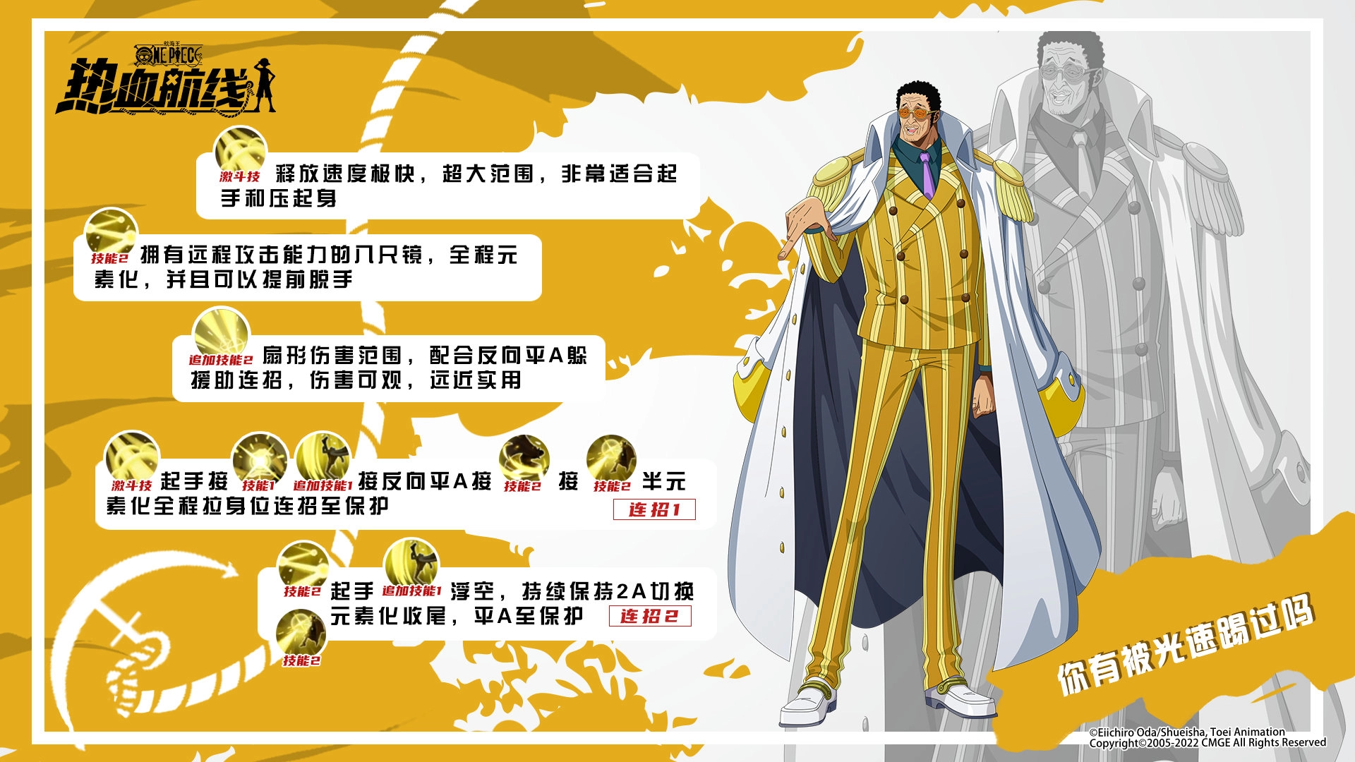 在《航海王热血航线》里,黄猿因食用了闪光果实,他的所有攻击都围绕“光”展开——无论是光的极速、光的穿透性,还是光的破坏力等,而他的连招能把这颗果实的能力彻底释放,从而更顺畅地打出高额伤害。