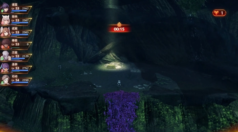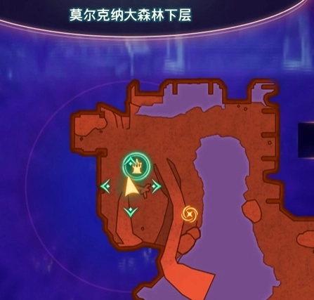 从闪耀水池出发,往左边行进,途中会经过一座桥,我们沿着右侧的山体走就行,到了有紫色藤蔓的地方就向左下坡走。