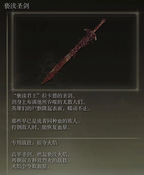 亵渎圣剑,其专属战技是掠夺火焰,在击败敌人后能够恢复生命值,比较适合用于开拓地图或者探索洞窟迷宫的场景。