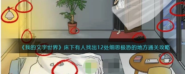 《我的文字世界》是近期抖音上热度很高的文字类游戏,其中“床下有人”这一关卡该如何通过呢?在这一关中,主角刚下班回到家,却发现家里处处透着诡异。玩家需要从家中找出12处细思极恐的细节,像床底下藏着一个人、床单上留有脚印、桌上放着热水、床头柜有被翻动过的痕迹等。下面为大家带来的是抖音小游戏《我的文字世界》“床下有人”关卡找出12处细思极恐之处的通关攻略,还没通过这关的小伙伴们可以来看看,参考攻略顺利过关。