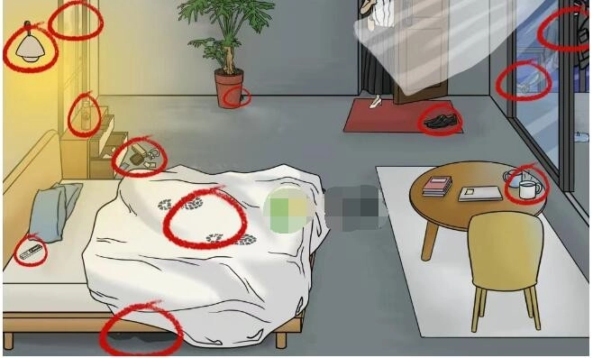 1、床下有人-需找出12处细思极恐的细节,分别是:刚洗的衣物、亮着的灯、录音笔、床底藏人、脚印、翻动痕迹、男士皮鞋、热水、窗外有人、诡异身影、黑猫、迷幻喷雾