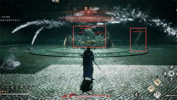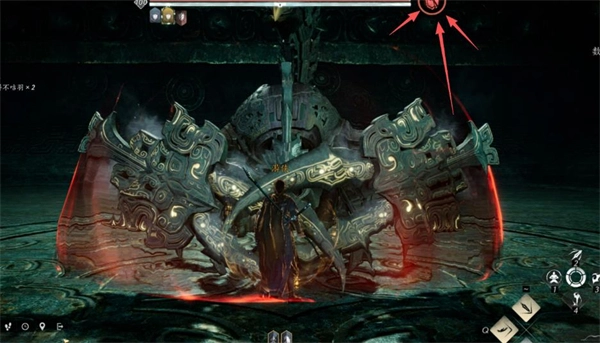 5、反噬,破甲后继续金身反弹黄光,即可积累易伤,血条旁进度条满后可进入反噬阶段,BOSS瘫痪。