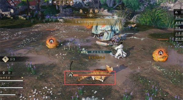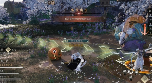 6、鱼的机制很有意思,BOSS会抛出一条锦鲤和三个藤球,同时指定一名玩家进入化猫状态。进入该状态的游侠要迅速避开藤球并拾取锦鲤,接着对御猫大王施放锦鲤旋风;而被猫卫盯上的游侠则需把猫卫引到藤球周边。