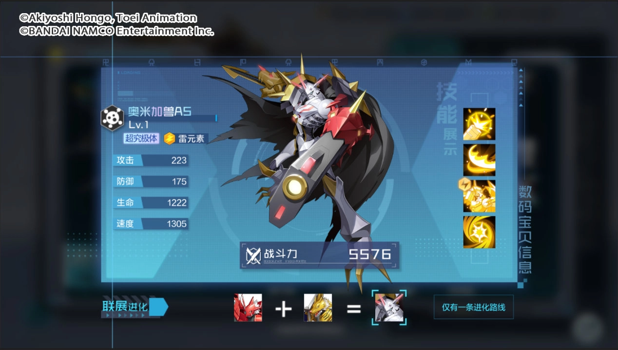 在游戏里,奥米加兽AS属于功能多样的辅助类数码宝贝,其特点在于能依据队友的元素属性(涵盖雷、火、光三种)来切换自身的元素属性,进而呈现出对应元素形态下的技能。它的得意技是在开场时,根据拥有雷、光、火元素属性的队友数量,转化为相应元素的拟态;释放该技能时,可解除我方全体成员的所有异常状态,还能赋予攻防提升效果。奥义技则是对敌方全体发起攻击,根据自身当前的拟态元素,在雷、光、火拟态下会分别给敌方施加过载、天罚、熔甲的标记,随后为我方全体回复一定生命值。通常技是攻击两个敌方单位,依据自身的拟态元素,在雷、光、火拟态下会分别对目标造成麻痹、驱散、灼烧效果。