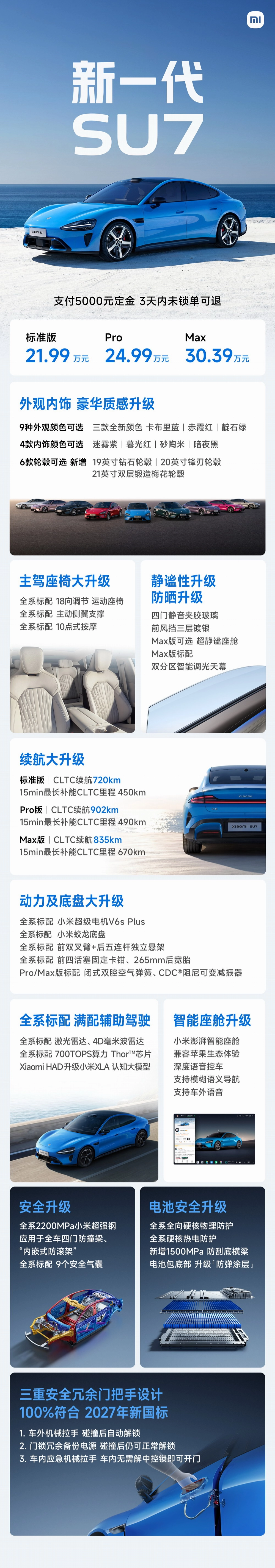 小米新一代SU7已正式发售,其中标准版定价21.99万元,Pro版24.99万元,Max版30.39万元。用户需支付5000元定金,若3天内未完成锁单,定金可全额退还。在5月5日24点前下单的用户,能够享受限时专属权益。而在3月22日24点前,用户还可限时调整配置,且交付周期不会受到影响。此外,小订用户以及第一代SU7的限时升级用户,在完成锁单后可获得优先排产的资格。