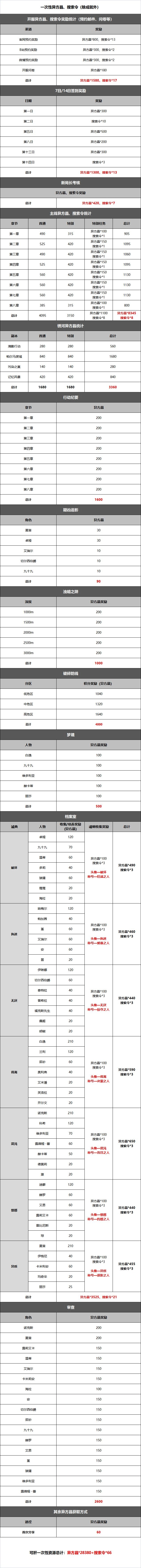 每月可再生资源:每个月大约能获取4000异方晶以及9张搜索令。