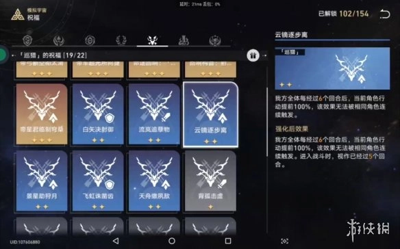这个效果能提升暴击率和暴击伤害,再搭配上面那个祝福还能回血。身上有会心状态时放大招,伤害会更可观。比如你有个速度特别快的角色,另一个速度比较普通,战斗时攻击顺序大概是:先快的行动,接着普通速度的行动,然后快的又到回合,之后敌方攻击,这样一个循环就结束了。这时候快的角色第二个回合已经叠了5层会心,如果敌方没中异常状态,这些会心就会全部消失。