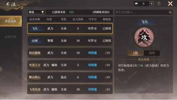 将军们在此能查看自己当前拥有的武将的全部主要术法,标注“可学习”的术法意味着其他武将可直接装备使用,只需进入武将详情页面,点击已解锁的次要术法栏位,就能完成学习与装备操作。