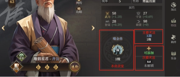每位武将的本命灵宝与主要术法是固定的,次要术法可自由搭配,所以各位将军需重点关注并培养的,便是两个次要术法的选择与培养方式。