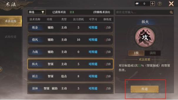 显示“可传道”的术法则是需要消耗1名以该术法为主要术法的武将,传道之后方可解锁该术法给其他武将使用。
