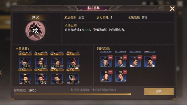传道获得的术法需通过修炼实现进一步升级,修炼过程需消耗武将,每次修炼要消耗数名同品质武将,消耗的武将等级越高,提升的修炼进度就越多,当修炼进度达到10时,修炼即可成功。