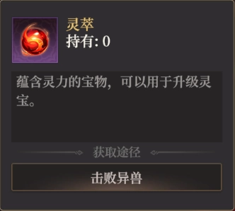 本命灵宝的升级需要用到“灵萃”,灵萃可以通过击败不同等级的异兽进行获取。