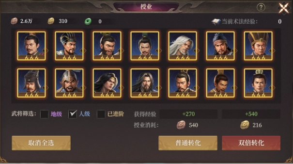 使用金贝转化术法经验或许会稍显昂贵,但相应地能得到双倍加成,各位将军可以依据武将的品阶和转化的数量,来合理挑选转化的方式。