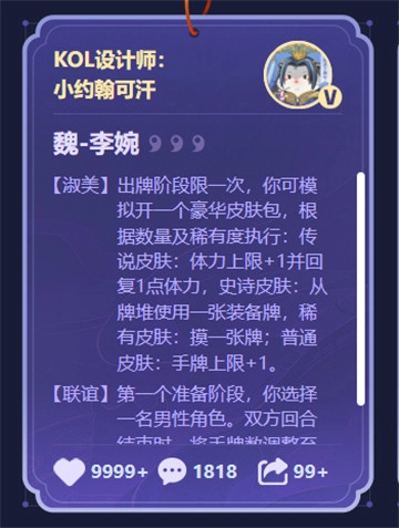 游戏ID为【追封青年】的玩家为「李婉」设计的技能成功入围,作为玩家设计代表,其作品紧扣李婉“才女”特质,整体技能围绕牌名字数展开设计,同时还考量了李婉与贾充的夫妻关系。一技能定名为【妙词】,取李婉和贾充临别联句精妙之意,借助次数与字数的重叠实现摸牌效果,尽显绝佳创意与巧思。本次大赛中这类兼具趣味与细节的设计层出不穷,为玩家们搭建了一个充分展现才华、增进交流的平台。