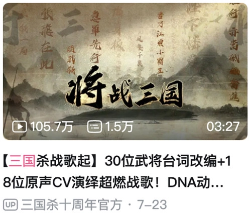 创玩节开幕当天,主题曲《战将三国》的MV在B站首次发布,播放量迅速突破百万。这支MV采用《三国杀十周年》里精致的武将原画和配音演员的演唱来呈现内容。歌曲以古风电子风格为基础,结合了嘻哈饶舌、戏腔、台词念白以及游戏经典配乐的Remix等多种元素,再次激发了玩家们对武将角色的喜爱之情。