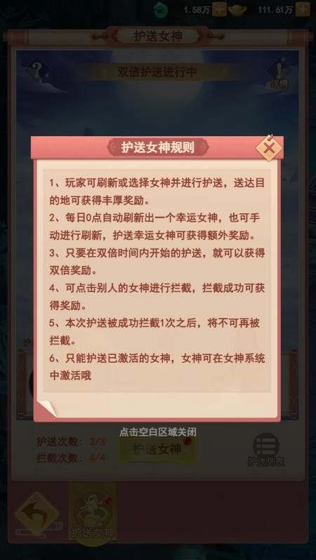 作为女神系统里的趣味玩法之一,护送女神可是和自家女神培养感情的好机会,而且每次护送都有丰厚的额外奖励。不过因为女神们人气太高,护送过程不会一帆风顺,中途可能会遇到其他道友的拦截,说不定里面还有八戒派来的卧底,道友们要多加小心提防。