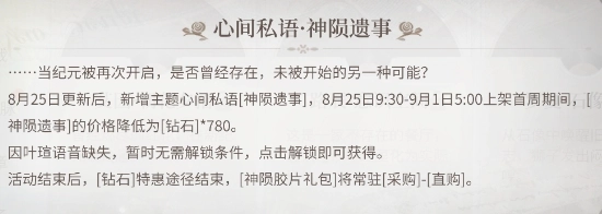 8月25日更新后,游戏内将新增主题心间私语「神陨遗事」。该主题于8月25日9:30至9月1日5:00的首周上架期间,售价调整为780钻石。