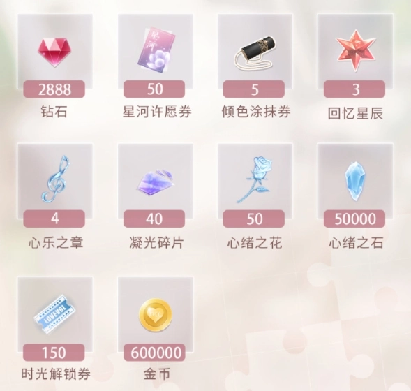 每天登录都能收到一封他发来的【心动邮件】,完成并分享充满回忆的拼图,就可以免费领取包含【星河许愿券*50、钻石*2888、倾色涂抹券*5】、总价值超过50888钻的丰厚奖励!