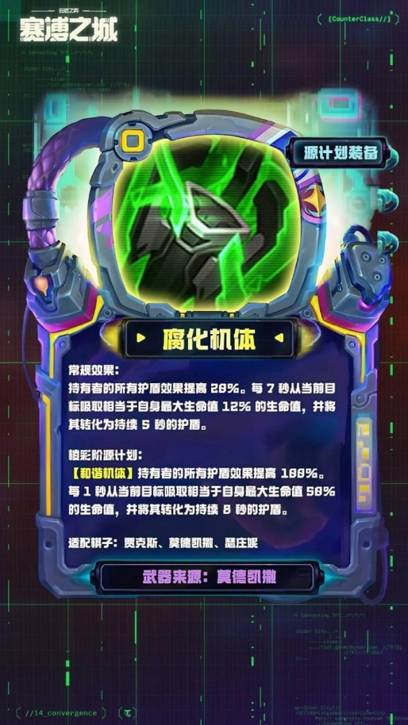 护盾效果提升20%,每间隔7秒可吸取自身最大生命值的12%转化为护盾,该护盾的持续时间为5秒。