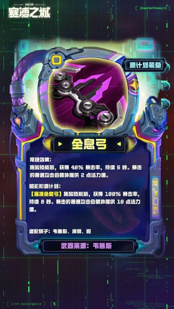 金铲铲之战s14赛季中,源计划羁绊的阵容与装备都有所调整,不少玩家对该羁绊下的武器品类不太清楚。目前源计划羁绊共有7把武器,分别是斥力灯笼、脉冲稳定器、超能獠牙、腐化机体、赛博线图、全息弓和时空电容器,每把武器都具备两种不同效果。下面将为大家详细介绍《金铲铲之战》s14源计划武器的具体信息!