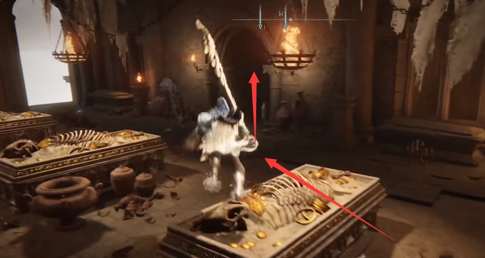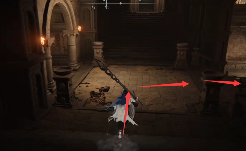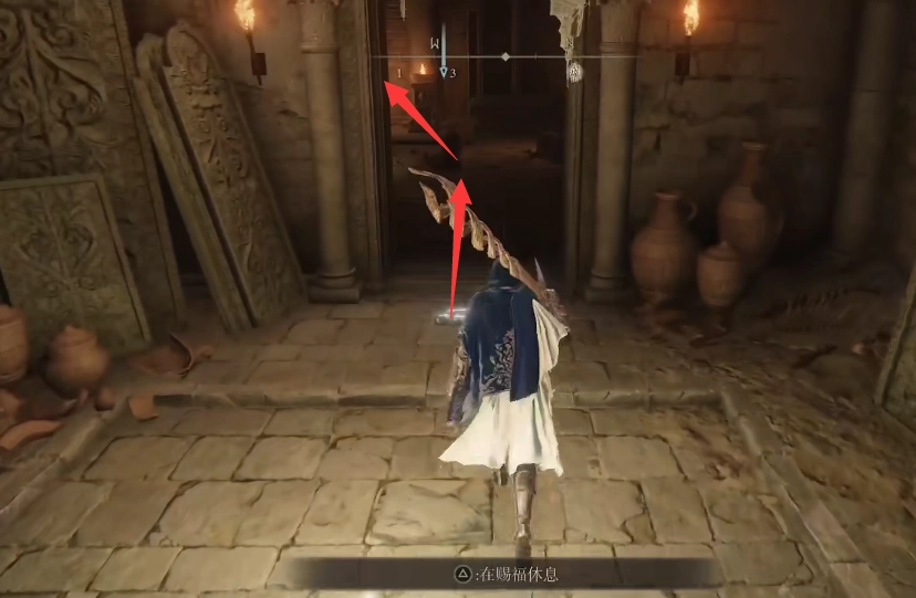 这个房间有几扇门,走过中间的台子,右手边就是图中箭头指向的拱门,从这里进去。
