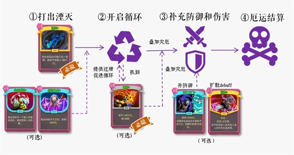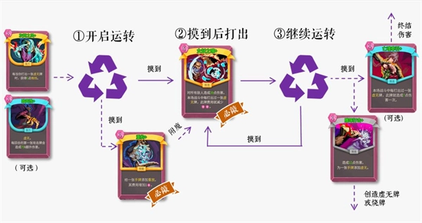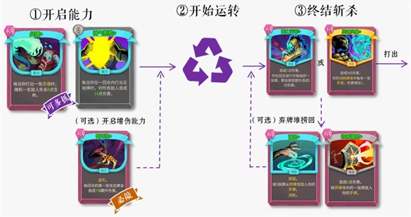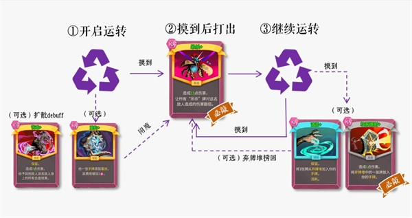 4、循环吊杀:借助吊杀卡牌指数级增长的伤害机制与灵魂运转体系出色的过牌能力,多次抓取并使用该牌,达成回合内对单个目标的爆发性伤害。鉴于吊杀叠加伤害的原理是为目标施加提升伤害倍率的Debuff(减益效果),在应对多个敌人时,可通过苦难技能扩散此效果,防止因切换目标导致倍率重置。另外,也能利用重构为吊杀增添重放(多次使用)的效果,不过若自身加费手段有限,需谨慎使用,以免费用过高造成卡牌无法顺利打出。吊杀玩法是典型的单卡支撑起一套玩法的模式,尽管吊杀属于金卡,稀有度较高,但一旦获取,基本就意味着玩法体系成型了。