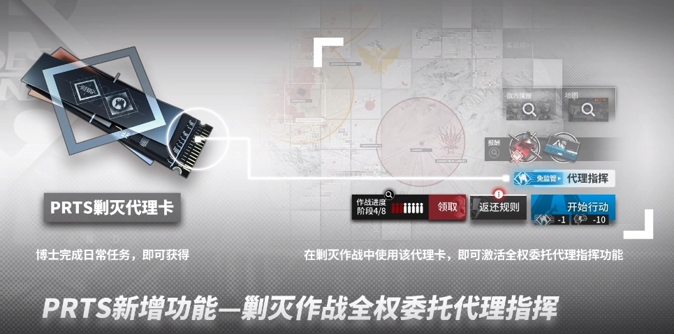 剿灭作战的全权委托代理指挥功能,要求玩家持有PRTS剿灭代理卡才能使用。该卡片可通过完成日常任务获取,同时日常任务的奖励也将新增两项内容,其中就包含剿灭代理卡。