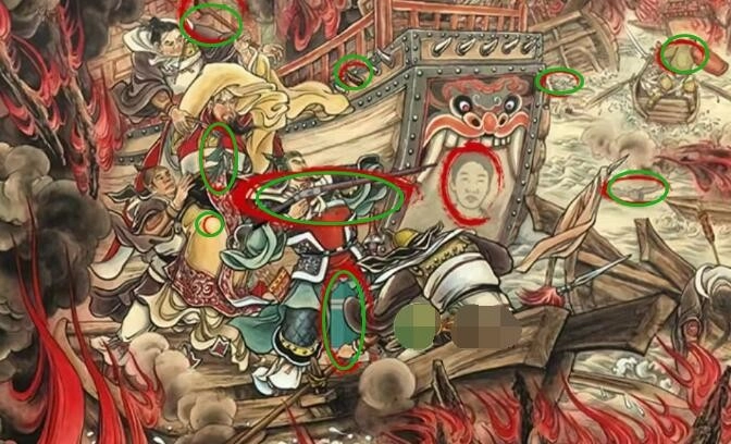 2、左上角的人握着痒痒挠,其下方的人手中是杨柳叶,膝盖处有“我的太阳”字样,旁边的人手持洋枪,最下方则放着一个氧气瓶。