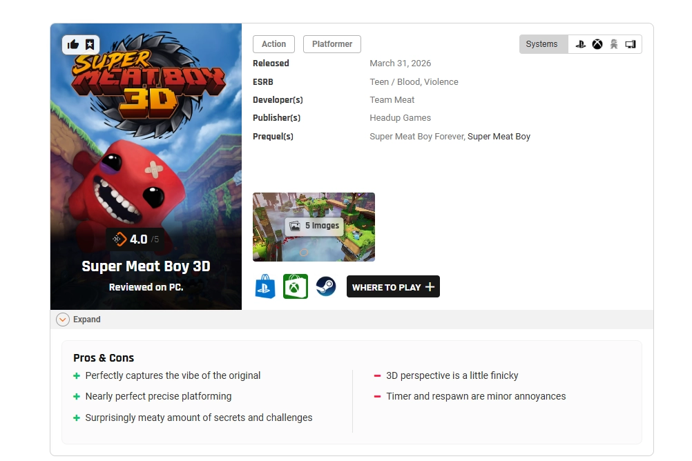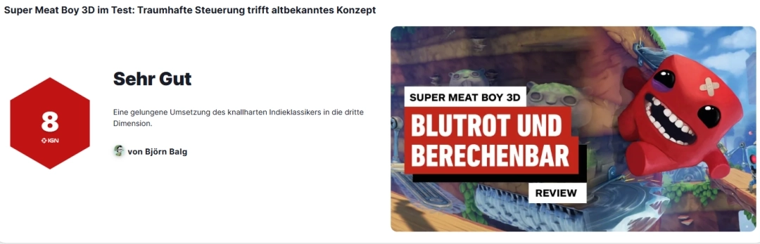尽管《超级食肉男孩3D》曾让我气得差点摔手柄——偶尔还会因为并非自己的失误而丧命——可当我在某道怎么都跳不上去的墙前撞得头破血流时,还是忍不住笑出声来。肉肉哥的传奇是种相当独特的体验,未必能吸引所有人,但即便存在些磕绊,《3D》也证明了自己足以与初代杰作并肩,堪称合格的续作。