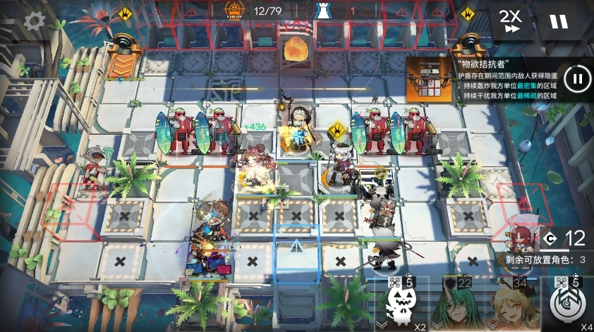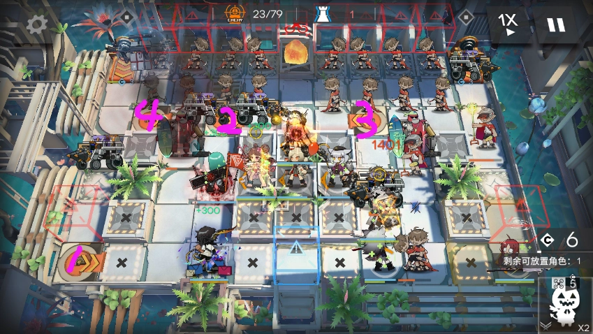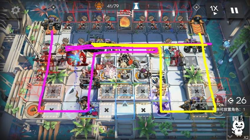 开局先在下方据点的左侧放置棘刺,方向朝上,这样棘刺就能借助停留在那里的敌人来充能。