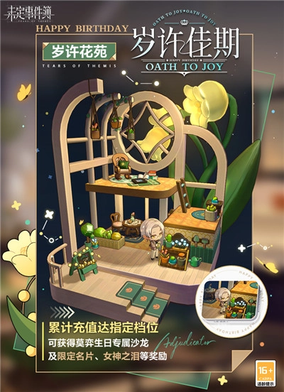 9月19日起,「岁许佳期」限时活动正式开启,玩家能在活动里和莫弈一起体验签文小游戏、解开寻物谜题。活动进行期间,完成生日限时任务就可以获得莫弈R思绪【浅尝】、生日限定服装【莫弈·佳期】、生日限定背景【斯沃尔特厨房】、活动纪念徽章【岁许佳期】以及【女神之泪】等众多限定奖励。