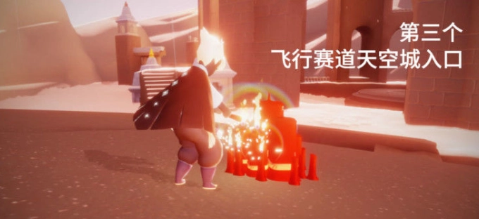 第三个大蜡烛的位置是霞谷飞行赛道的天空城入口,玩家在这里能找到第三堆大蜡烛。