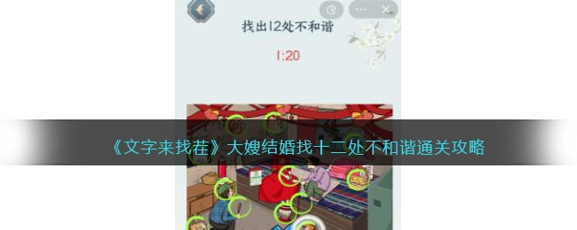 文字来找茬是一款融合文字、解谜与找茬元素的小游戏。文字来找茬大嫂结婚这关怎么通关?这是一个找茬关卡,需要在图里找出十二处不和谐的地方,有些地方可能不太容易点到,需要放大图片查看。下面是具体的过关答案,还不了解《文字来找茬》大嫂结婚找十二处不和谐通关攻略图文的朋友,来看看接下来的介绍吧!