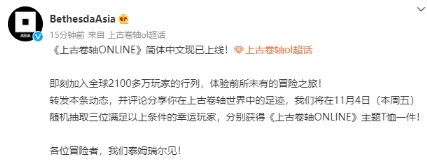 根据B社官方微博发布的消息,《上古卷轴ONLINE》的简体中文版本现已正式推出,玩家现在就可以加入全球超过2100万玩家的大家庭,开启一段前所未有的冒险旅程!