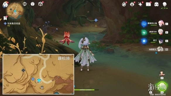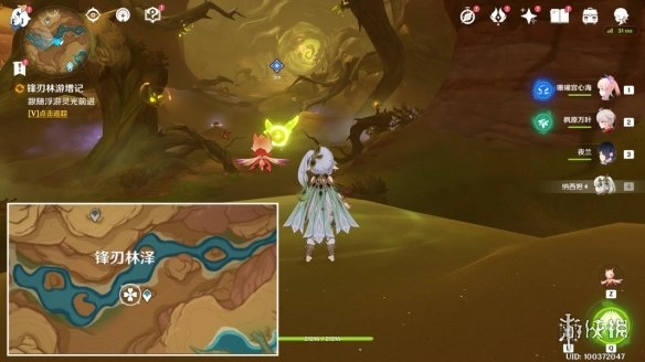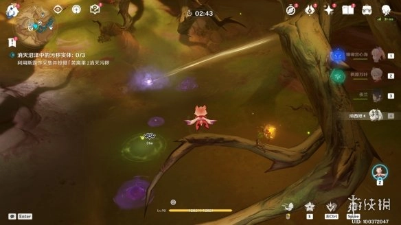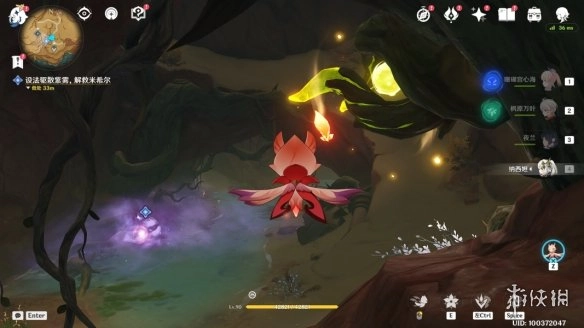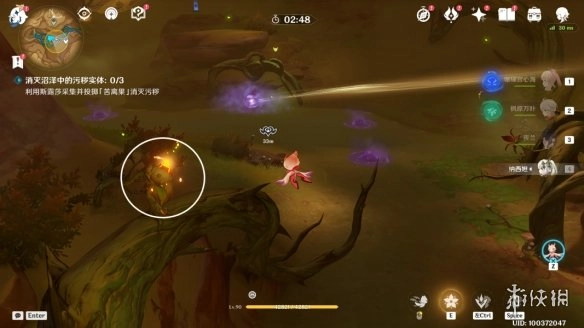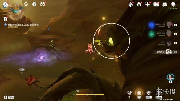 2,操控「花灵」,靠近荆棘枝条短e一下,就能驱散紫雾
